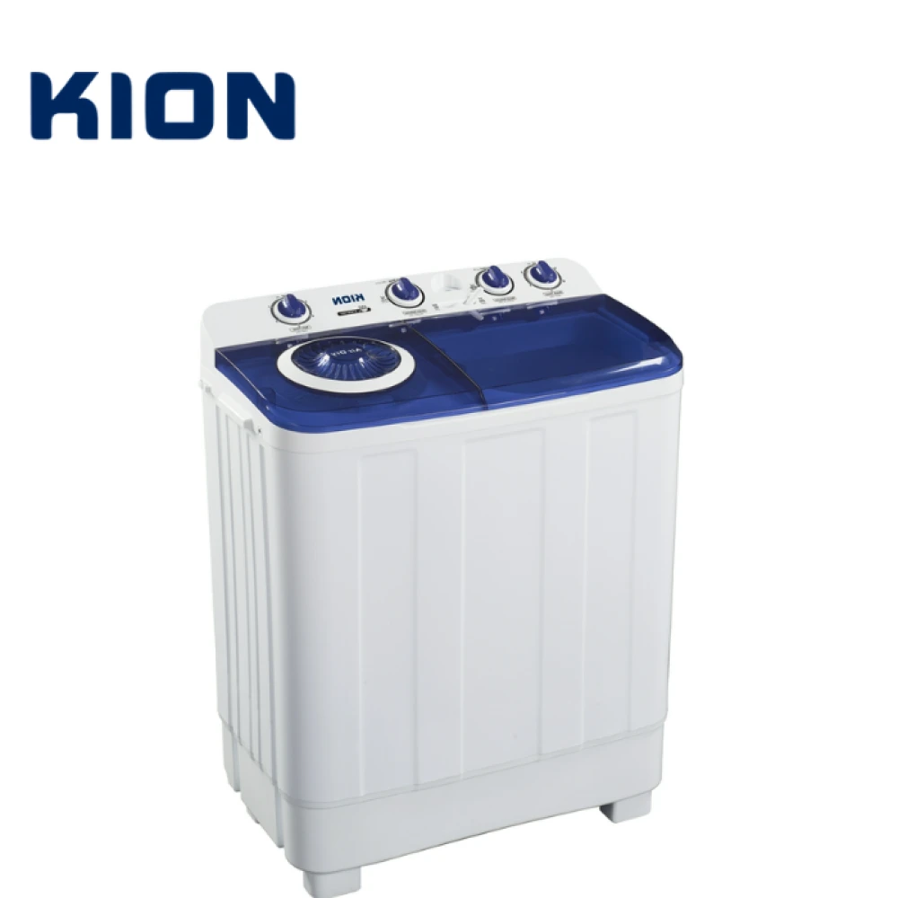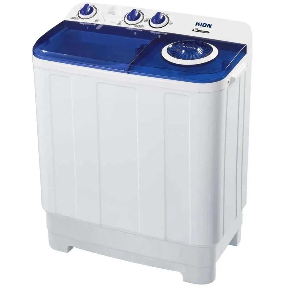 غسالة كيون حوضين 12 كيلو — أبيض مع غطاء أزرق وتنشيف سريع KION